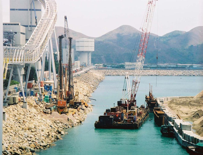 该工程是在香港南丫岛电厂南部海域填海造地105000平方米,并修建防浪墙、排水等必要的基础设施。该工程包括海上疏浚、粉煤灰回填、土工布安放、重力式混凝土方块顺岸码头、重达8500吨的巨型钢筋混凝土沉箱预制构件预制安装、回填砂石、斜坡式抛石堤及海上联络桥基础等项目。